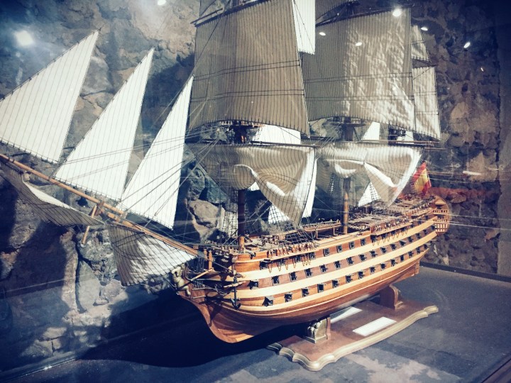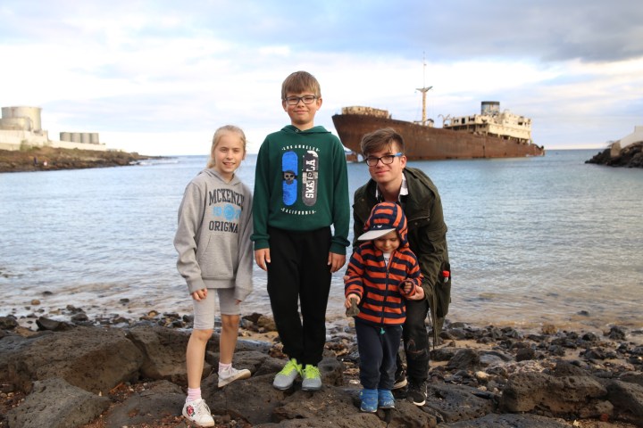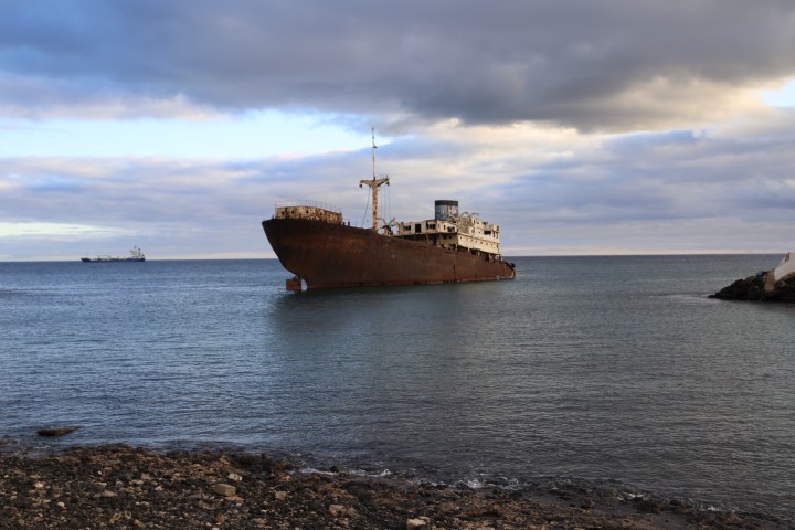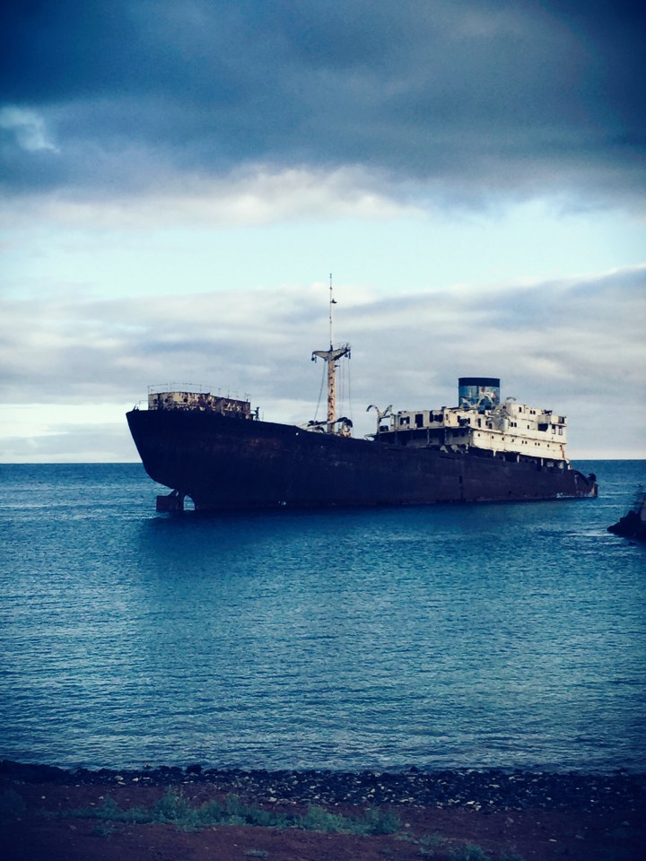 wpadliśmy do baru coś przekąsić. Mały lokalny bar okazał się znakomicie przystosowany dla dzieci, do tego obsługa znała czeski! Antoś wsiąkł na godzinę, zamówiliśmy tortillę, myśląc o meksykańskiej wersji. Przyszła hiszpańska, zbliżona do omleta. Całkiem całkiem. Poprawiliśmy cervezą i wyruszyliśmy w podróż powrotną. TripAdvisor podpowiedział jedną atrakcję, którą mogliśmy zrobić po drodze. W Arrecife utknął wrak greckiego statku towarowego The Telamon, który wracając w 1981 roku z Abidżanu (Nigerią) podczas sztormu nabrał wody i dryfując utknął na mieliźnie. Władze postanowiły usunąć wrak w 2014, proces trwa😀
