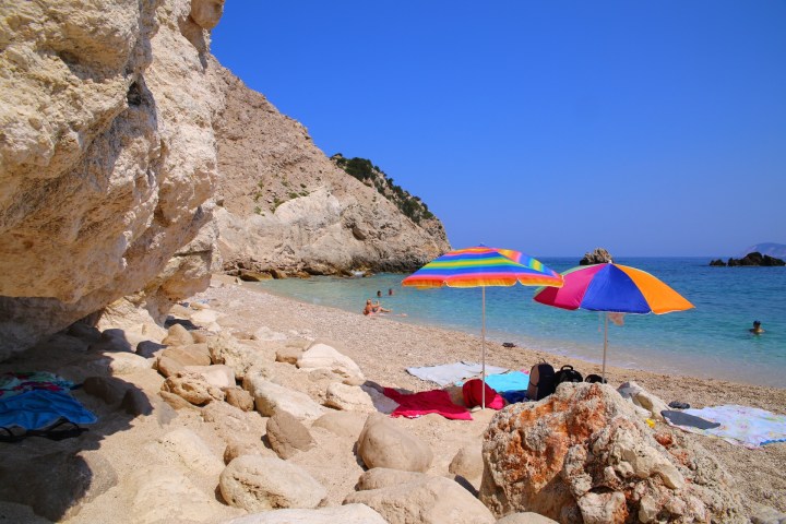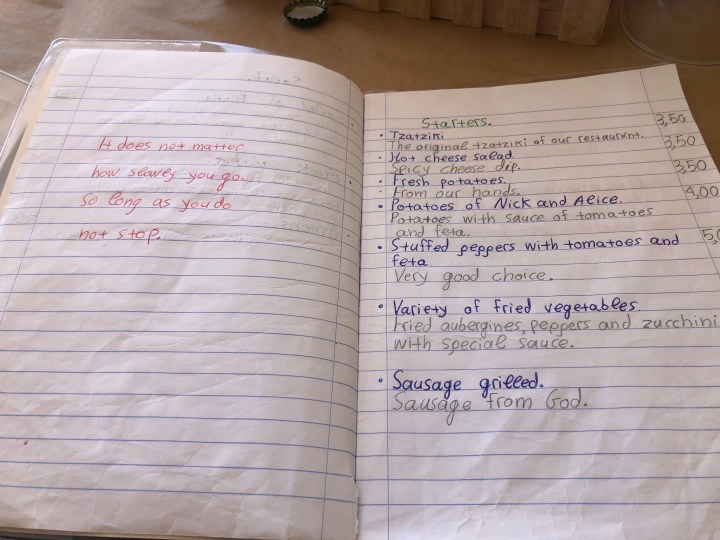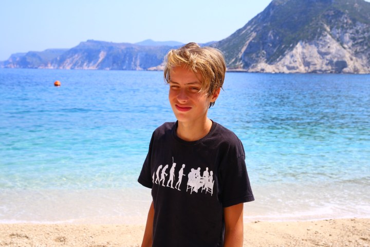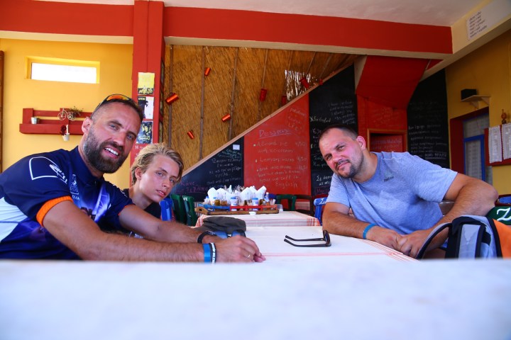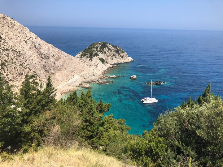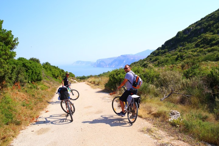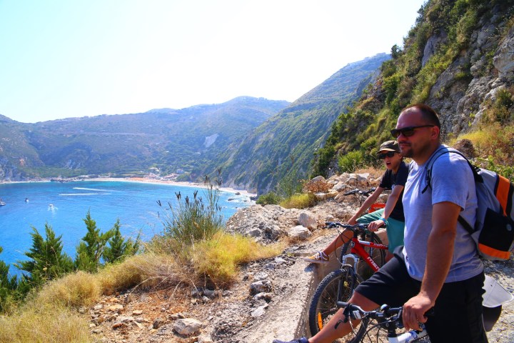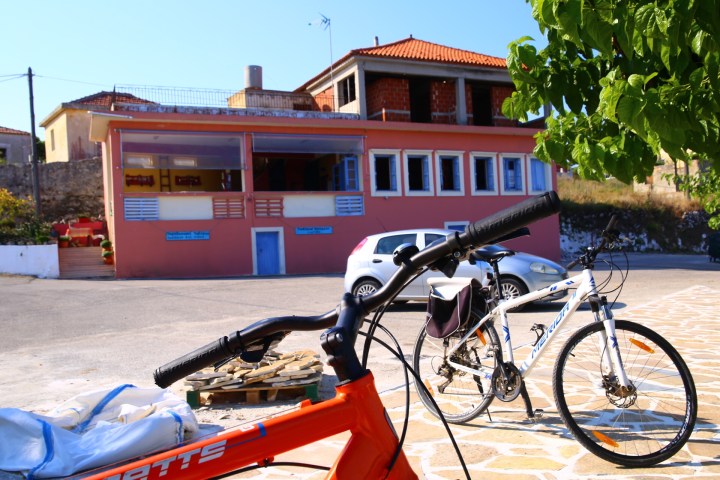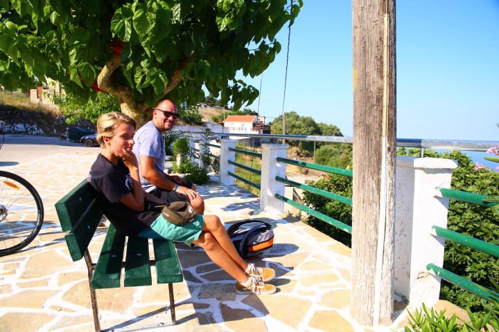 Po morderczych podjazdach dotarliśmy do tradycyjnej tawerny, znów przed otwarciem. Scenariusz się powtórzył😀 Właściciel potwierdził, że wybraliśmy najlepszą plażę na Kefaloni. Natomiast szokiem dla niego był fakt, że wybieramy się tam rowerami😉 Odpowiedz, że jesteśmy z Polski troszkę Go uspokoiła😉