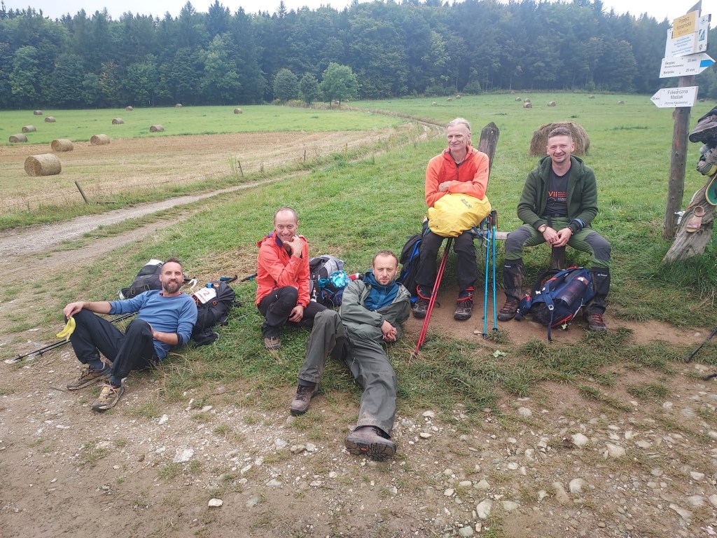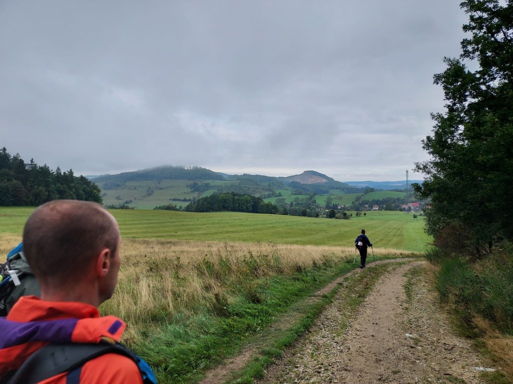 Mieliśmy trochę odcinków przez pastwiska z krowami, dopiero na ostatnim Grzesiu zwrócił mi uwagę, że idę z czerwoną osłoną przeciwdeszczową na plecaku😉