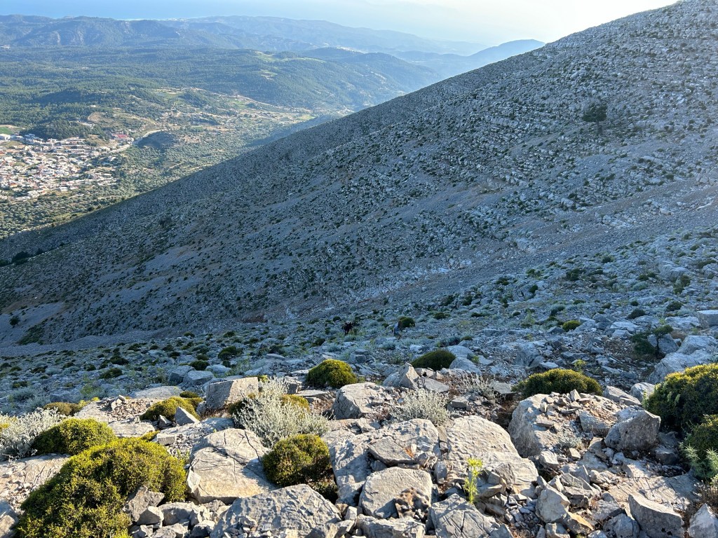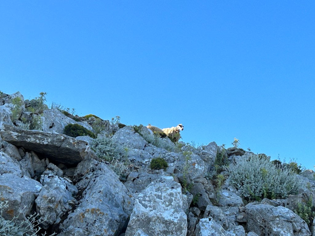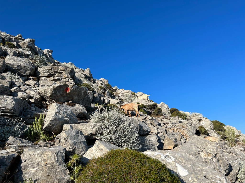Trasa wg mapy nie wyglądała na specjalnie wymagającą 2,5km jednak 800m przewyższenia. Wydawało się, że po 2,5h powinnismy być z powrotem. Założenia sprawdziły się połowicznie, po 2,5h byliśmy dopiero na szczycie, używając wszystkich kończyn do wspinania😁 Szlak był niebezpieczny, wiódł trudnym terenem, stromym żlebem z mnóstwem kamieni i skał, często luźno związanych z podłożem. Spotkaliśmy mnóstwo kóz i baranów, które sprawnie pokonywały najtrudniejsze ścieżki: