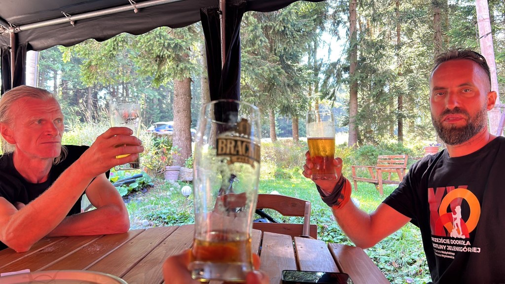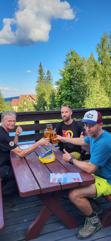 Kolejne 2h marszu i wróciliśmy znów do Rozdroża Izerskiego, następnie podejście pod Zwalisko, 13. przedostatni punkt kontrolny i znajoma droga do Jakuszyc przez Rozdroże pod Cichą Równią. Natrafiliśmy na spory niedzielny ruch – miły widok uśmiechniętych, aktywnych ludzi. Dobre tempo pozwoliło nam na wizytę w restauracji, mieliśmy smaka na dobry obiad😉