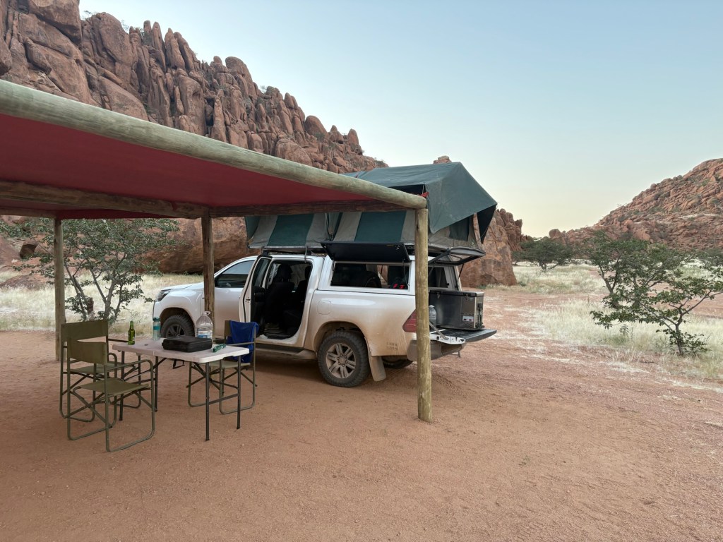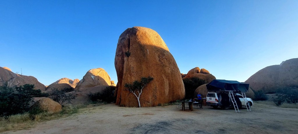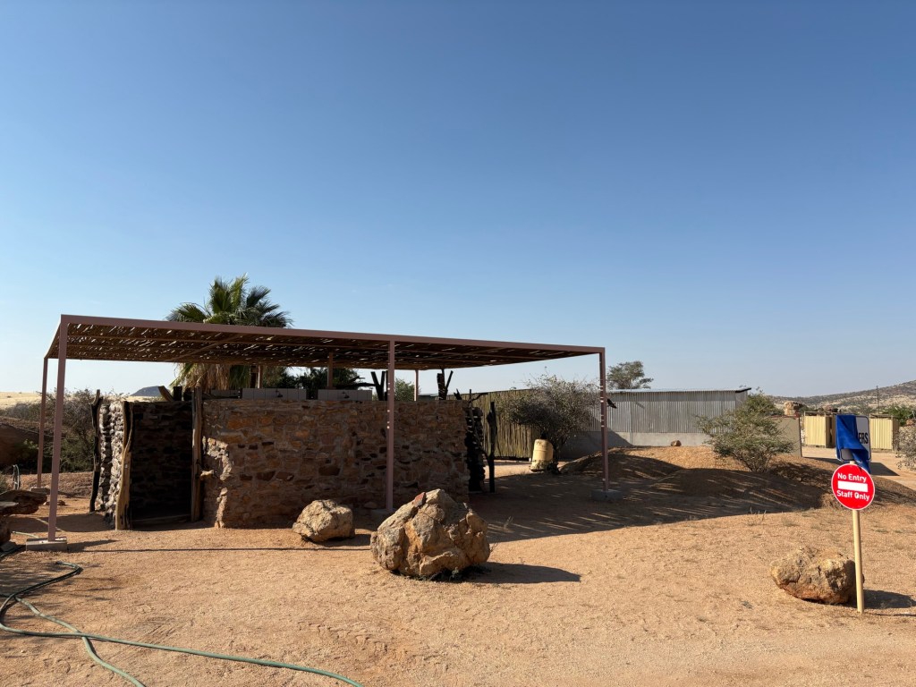 Kemping Spitzkoppe prowadzony przez lokalną społeczność, okazał się nadzwyczaj komfortowy. Znaleźliśmy ku zaskoczeniu, czynne prysznice, zwracam uwagę że jesteśmy ciągle na pustyni!